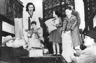 A Korean refugee mother carries her child on her back through the streets of Pusan, the United Nations communications centre during the Korean war, 1950. (Photo by Bert Hardy)